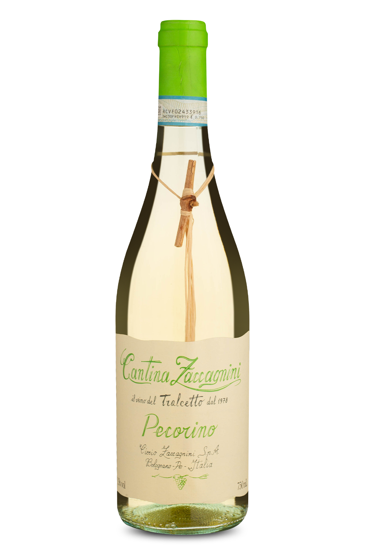 Fundada em 1978 em Bolognano, uma pequena aldeia no coração de Abruzzo, centro-sul da Itália, a Cantina Zaccagnini surgiu com o propósito de produzir vinhos que representam a diversidade de uma terra extraordinária, Abruzzo, também conhecida como o “pulmão verde da Europa”, que se estende desde o coração da cordilheira dos Apeninos até o Mar Adriático, em um cenário natural principalmente montanhoso e selvagem. Para Zaccagnini, o vinho é uma manifestação artística do ser humano, e o vinho, a arte e o respeito e orgulho pelo território andam juntos. Os vinhos da linha “Tralcetto” são representados pelo típico raminho de videira no gargalo da garrafa - registro cultural dos vinhos de Abruzzo - e simbolizam as raízes mais profundas nas quais se baseia o vínculo entre vinho e território. Esses tralcettos são colhidos após a poda anual nos vinhedos de Abruzzo e fixados à mão em cada garrafa com um gesto antigo e artesanal que traz um toque de magia às mesas ao redor do mundo. A uva Pecorino, muito plantada no centro-sul da Itália, em especial em Marche e Abruzzo, recebeu esse nome em homenagem às ovelhas, “pecora”, em italiano, pois, supostamente, era a uva favorita dos rebanhos de ovelhas. Pecorino é mais amplamente associado ao queijo Pecorino, que é feito de leite de ovelha, todavia, não tem nenhuma relação com a uva, exceto por sua ligação etimológica. Pecorino dá vida a vinhos com grande complexidade aromática, paladar suculento, mineral e refrescante. Este é um exemplar muito aromático, volumoso, equilibrado, refrescante e mineral.